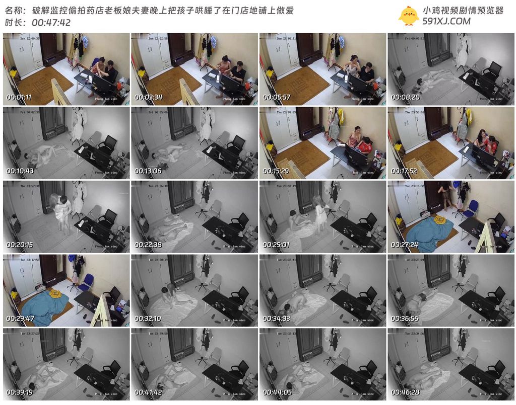 破解监控偷拍药店老板娘夫妻晚上把孩子哄睡了在门店地铺上做爱